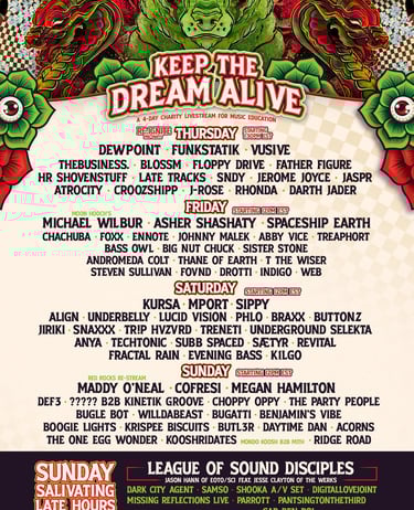 Keep the Dream Alive began early on in GRiZ's hiatus, drawing inspiration from his past charity events. What started as a passion project between friends is now a global community of artists, creators, & advocates who raise money and share their art with the world via livestreamed events.